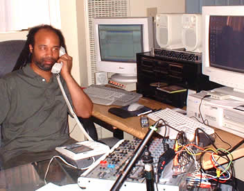 Keidi Obi Awadu at home in the broadcast studio for LIBRadio.com